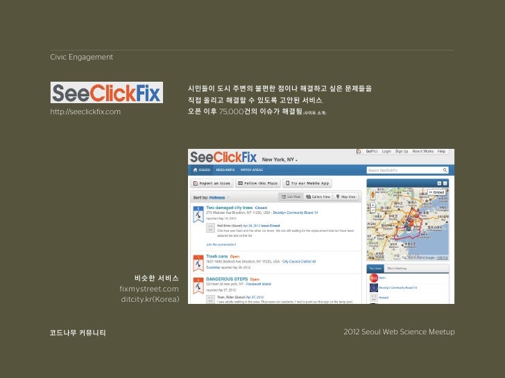 31. 31. Civic Engagement 시민들이 도시 주변의 불편한 점이나 해결하고 싶은 문제들을 직접 올리고 해결할 수 있도록 고안된 서비스.http://seeclickfix.com 오픈 이후 75,000건의 이슈가 해결됨 (사이트 소개) 비슷한 서비스 fixmystreet.com ditcity.kr(Korea)코드나무 커뮤니티 2012 Seoul Web Science Meetup