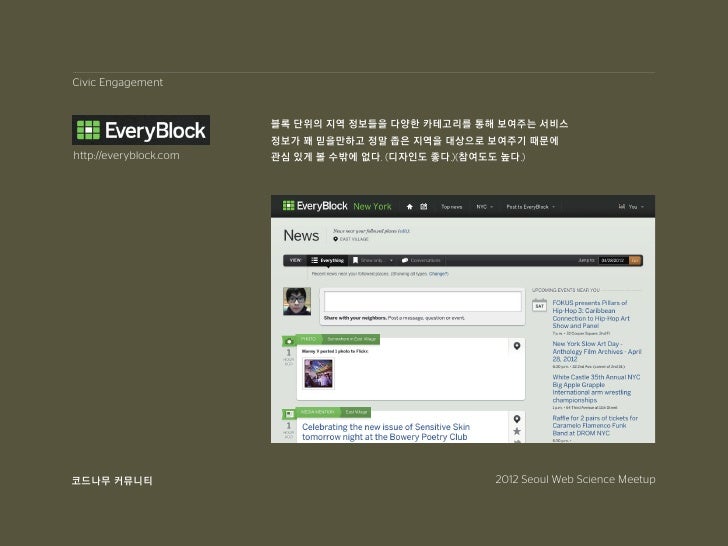 32. 32. Civic Engagement 블록 단위의 지역 정보들을 다양한 카테고리를 통해 보여주는 서비스 정보가 꽤 믿을만하고 정말 좁은 지역을 대상으로 보여주기 때문에http://everyblock.com 관심 있게 볼 수밖에 없다. (디자인도 좋다.)(참여도도 높다.)코드나무 커뮤니티 2012 Seoul Web Science Meetup