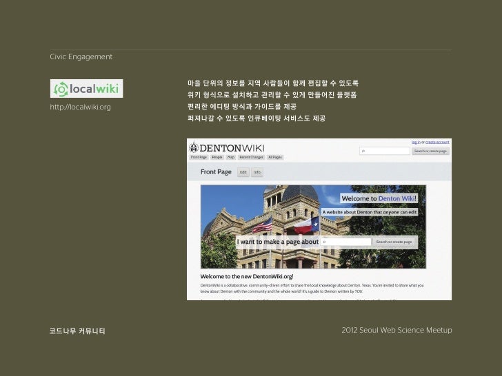 33. 33. Civic Engagement 마을 단위의 정보를 지역 사람들이 함께 편집할 수 있도록 위키 형식으로 설치하고 관리할 수 있게 만들어진 플랫폼http://localwiki.org 편리한 에디팅 방식과 가이드를 제공 퍼져나갈 수 있도록 인큐베이팅 서비스도 제공코드나무 커뮤니티 2012 Seoul Web Science Meetup