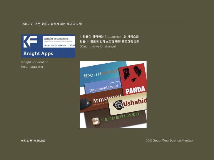 34. 34. 그리고 이 모든 것을 가능하게 하는 재단의 노력 시민들이 참여하는 Engagement형 서비스를 만들 수 있도록 컨테스트형 펀딩 프로그램 운영 (Knight News Challenge)Knight Foundationknightapps.org코드나무 커뮤니티 2012 Seoul Web Science Meetup