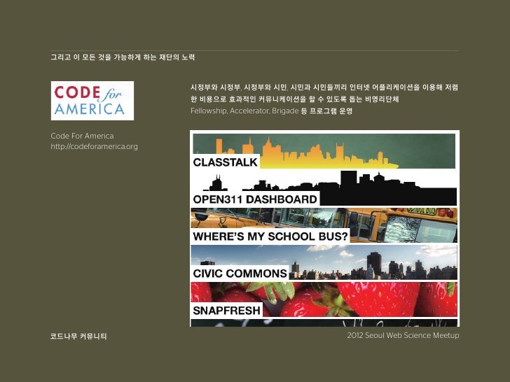 35. 35. 그리고 이 모든 것을 가능하게 하는 재단의 노력 시정부와 시정부, 시정부와 시민, 시민과 시민들끼리 인터넷 어플리케이션을 이용해 저렴 한 비용으로 효과적인 커뮤니케이션을 할 수 있도록 돕는 비영리단체 Fellowship, Accelerator, Brigade 등 프로그램 운영Code For Americahttp://codeforamerica.org코드나무 커뮤니티 2012 Seoul Web Science Meetup