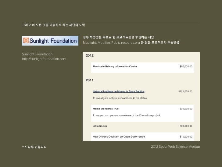 36. 36. 그리고 이 모든 것을 가능하게 하는 재단의 노력 정부 투명성을 목표로 한 프로젝트들을 후원하는 재단 Maplight, Mobilize, Public.resource.org 등 많은 프로젝트가 후원받음Sunlight Foundationhttp://sunlightfoundation.com코드나무 커뮤니티 2012 Seoul Web Science Meetup