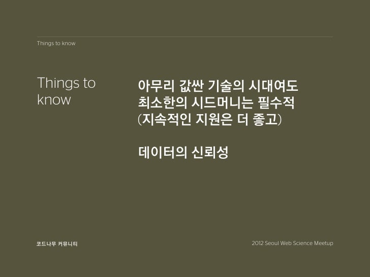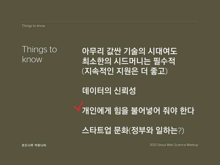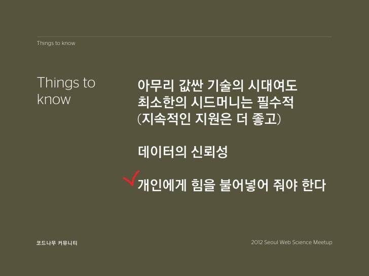 40. 40. Things to knowThings to 아무리 값싼 기술의 시대여도know 최소한의 시드머니는 필수적 (지속적인 지원은 더 좋고) 데이터의 신뢰성 개인에게 힘을 불어넣어 줘야 한다코드나무 커뮤니티 2012 Seoul Web Science Meetup