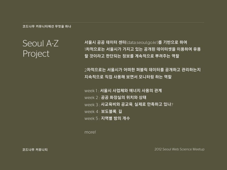 43. 43. 코드나무 커뮤니티에선 무엇을 하나Seoul A-Z 서울시 공공 데이터 센터(data.seoul.go.kr)를 기반으로 하여 1차적으로는 서울시가 가지고 있는 공개된 데이터셋을 이용하여 유용Project 할 것이라고 판단되는 정보를 계속적으로 뿌려주는 역할 2차적으로는 서울시가 어떠한 퍼블릭 데이터를 공개하고 관리하는지 지속적으로 직접 사용해 보면서 모니터링 하는 역할 week 1 : 서울시 사업체와 에너지 사용의 관계 week 2 : 공공 화장실의 위치와 상태 week 3 : 사교육비와 공교육, 실제로 만족하고 있나? week 4 : 보도블록, 길 week 5 : 지역별 방의 개수 more!코드나무 커뮤니티 2012 Seoul Web Science Meetup
