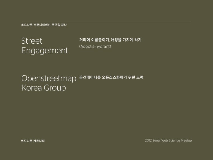 44. 44. 코드나무 커뮤니티에선 무엇을 하나Street 거리에 이름붙이기, 애정을 가지게 하기 (Adopt-a-hydrant)EngagementOpenstreetmap 공간데이터를 오픈소스화하기 위한 노력Korea Group코드나무 커뮤니티 2012 Seoul Web Science Meetup