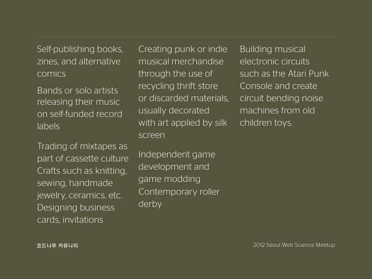 6. 6. Self-publishing books, Creating punk or indie Building musicalzines, and alternative musical merchandise electronic circuitscomics through the use of such as the Atari PunkBands or solo artists recycling thrift store Console and createreleasing their music or discarded materials, circuit bending noiseon self-funded record usually decorated machines from oldlabels with art applied by silk children toys. screenTrading of mixtapes aspart of cassette culture Independent gameCrafts such as knitting, development andsewing, handmade game moddingjewelry, ceramics, etc. Contemporary rollerDesigning business derbycards, invitations코드나무 커뮤니티 2012 Seoul Web Science Meetup