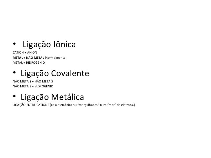 2. 2. • Ligação IônicaCATION + ANIONMETAL + NÃO METAL (normalmente)METAL + HIDROGÊNIO• Ligação CovalenteNÃO METAIS + NÃO METAISNÃO METAIS + HIDROGÊNIO• Ligação MetálicaLIGAÇÃO ENTRE CATIONS (cola eletrônica ou “mergulhados” num “mar” de elétrons.)