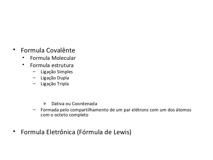 3. 3. • Formula Covalênte • Formula Molecular • Formula estrutura – Ligação Simples – Ligação Dupla – Ligação Tripla » Dativa ou Coordenada – Formada pelo compartilhamento de um par elétrons com um dos átomos com o octeto completo• Formula Eletrônica (Fórmula de Lewis)