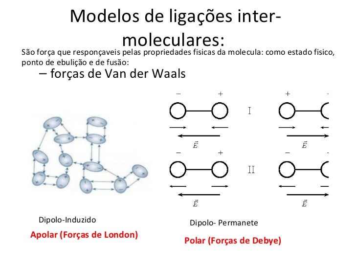 8. 8. Modelos de ligações inter- moleculares: molecula: como estado fisico,São força que responçaveis pelas propriedades fisicas daponto de ebulição e de fusão: – forças de Van der Waals Dipolo-Induzido Dipolo- Permanete Apolar (Forças de London) Polar (Forças de Debye)