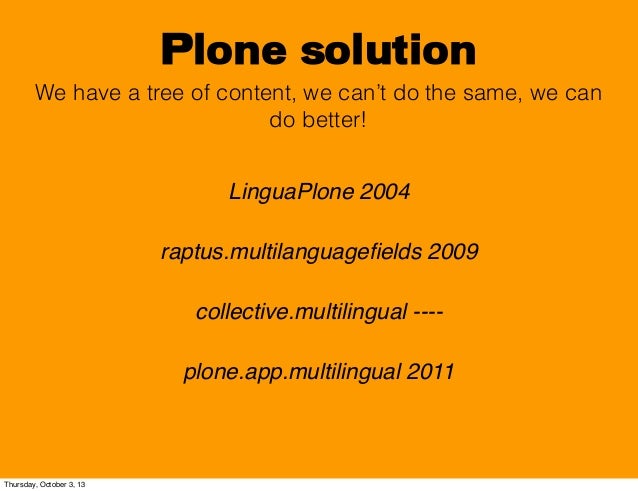 10. 10. Plone solution We have a tree of content, we can’t do the same, we can do better! LinguaPlone 2004 raptus.multilanguagefields 2009 collective.multilingual ---- plone.app.multilingual 2011 Thursday, October 3, 13