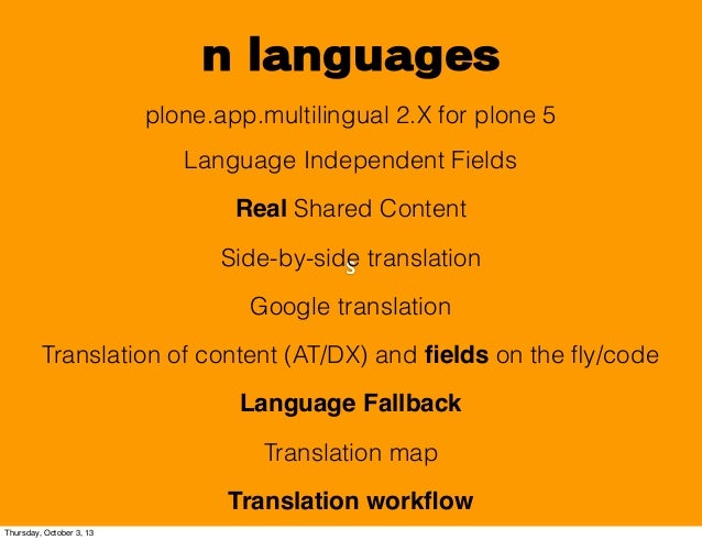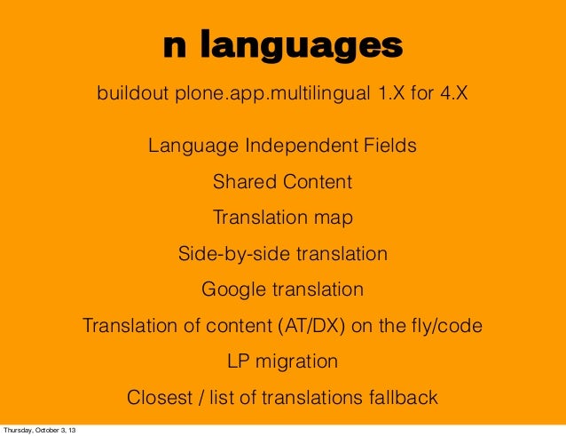 14. 14. n languages buildout plone.app.multilingual 1.X for 4.X Language Independent Fields Shared Content Translation map Side-by-side translation Google translation Translation of content (AT/DX) on the fly/code LP migration Closest / list of translations fallback Thursday, October 3, 13