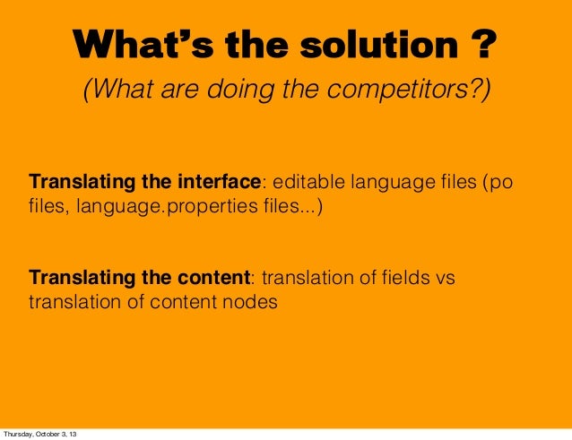 5. 5. What’s the solution ? (What are doing the competitors?) Translating the interface: editable language files (po files, language.properties files...) Translating the content: translation of fields vs translation of content nodes Thursday, October 3, 13