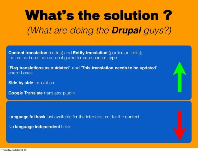 6. 6. What’s the solution ? (What are doing the Drupal guys?) Content translation (nodes) and Entity translation (particular fields); the method can then be configured for each content type "Flag translations as outdated" and "This translation needs to be updated" check boxes Side by side translation Google Translate translator plugin Language fallback just available for the interface, not for the content No language independent fields Thursday, October 3, 13