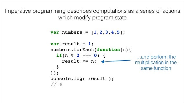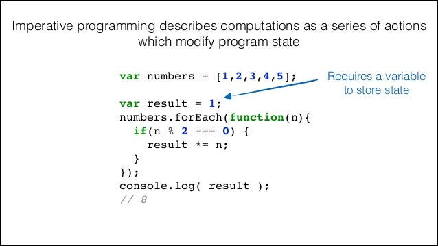 14. 14. Imperative programming describes computations as a series of actions which modify program state var result = 1;! numbers.forEach(function(n){! if(n % 2 === 0) {! result *= n;! }! });! console.log( result );! // 8! var numbers = [1,2,3,4,5]; Requires a variable to store state