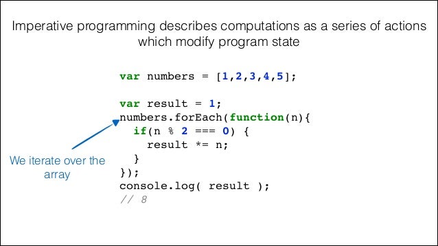 15. 15. var result = 1;! numbers.forEach(function(n){! if(n % 2 === 0) {! result *= n;! }! });! console.log( result );! // 8! var numbers = [1,2,3,4,5]; We iterate over the array Imperative programming describes computations as a series of actions which modify program state