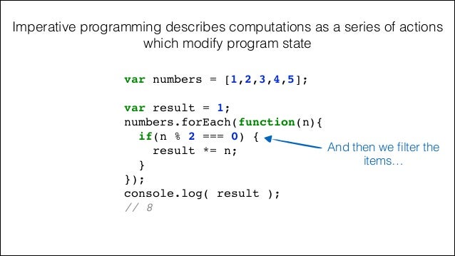 16. 16. var result = 1;! numbers.forEach(function(n){! if(n % 2 === 0) {! result *= n;! }! });! console.log( result );! // 8! var numbers = [1,2,3,4,5]; And then we filter the items… Imperative programming describes computations as a series of actions which modify program state