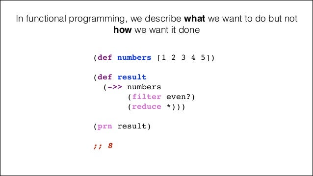 18. 18. (def numbers [1 2 3 4 5])! ! (def result! (->> numbers! (filter even?)! (reduce *)))! ! (prn result)! ! ;; 8 In functional programming, we describe what we want to do but not how we want it done