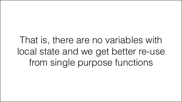 19. 19. That is, there are no variables with local state and we get better re-use from single purpose functions