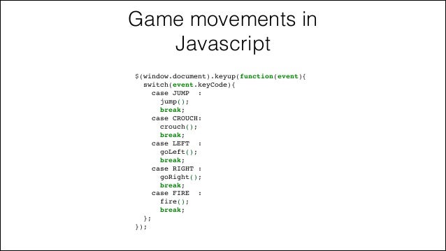 23. 23. Game movements in Javascript $(window.document).keyup(function(event){! switch(event.keyCode){! case JUMP :! jump();! break;! case CROUCH:! crouch();! break;! case LEFT :! goLeft();! break;! case RIGHT :! goRight();! break;! case FIRE :! fire();! break;! };! });
