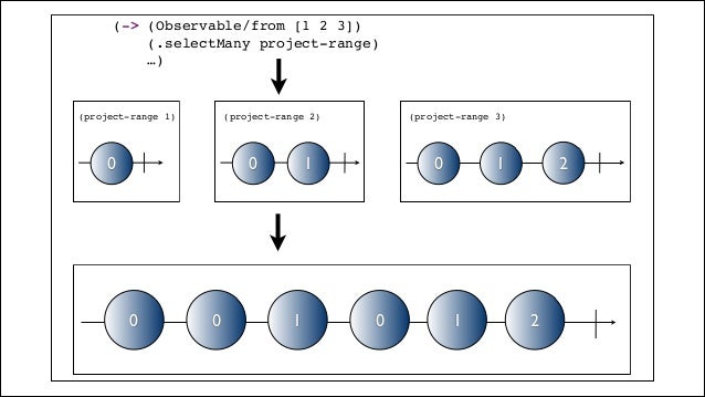 35. 35. (-> (Observable/from [1 2 3])! (.selectMany project-range)! …) (project-range 2) 0 1 (project-range 1) 0 (project-range 3) 0 1 2 0 0 1 0 1 2
