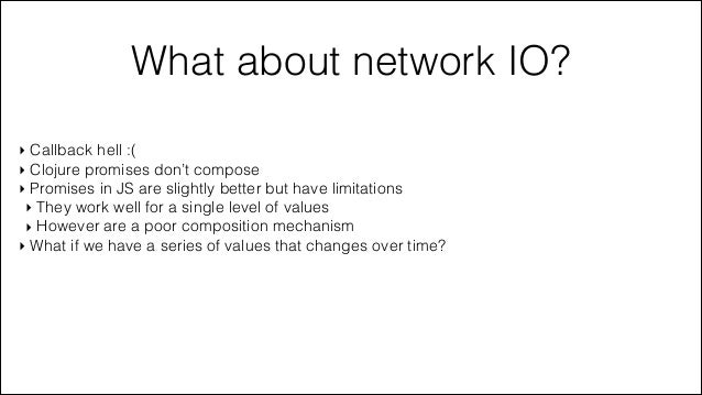 36. 36. What about network IO? ‣ Callback hell :( ‣ Clojure promises don’t compose ‣ Promises in JS are slightly better but have limitations ‣ They work well for a single level of values ‣ However are a poor composition mechanism ‣ What if we have a series of values that changes over time?