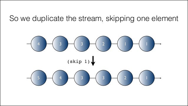 42. 42. So we duplicate the stream, skipping one element 4 3 3 2 1 1 5 4 3 3 2 1 (skip 1)