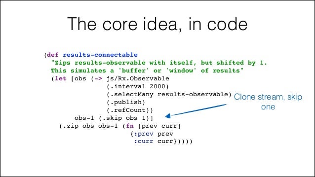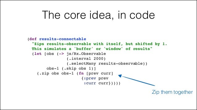 47. 47. The core idea, in code (def results-connectable! "Zips results-observable with itself, but shifted by 1.! This simulates a 'buffer' or 'window' of results"! (let [obs (-> js/Rx.Observable! (.interval 2000)! (.selectMany results-observable))! obs-1 (.skip obs 1)]! (.zip obs obs-1 (fn [prev curr]! {:prev prev! :curr curr}))))! Zip them together