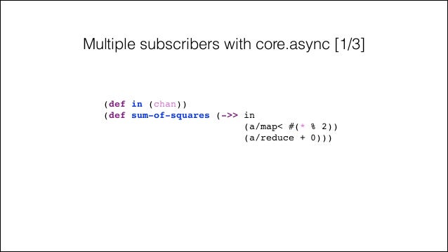 57. 57. Multiple subscribers with core.async [1/3] (def in (chan))! (def sum-of-squares (->> in! (a/map< #(* % 2))! (a/reduce + 0)))!