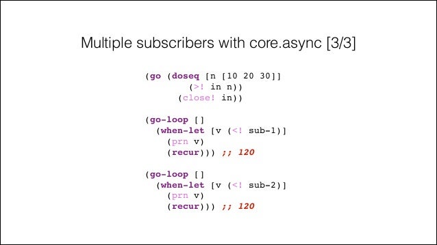 59. 59. Multiple subscribers with core.async [3/3] (go (doseq [n [10 20 30]]! (>! in n))! (close! in))! ! (go-loop []! (when-let [v (<! sub-1)]! (prn v)! (recur))) ;; 120! ! (go-loop []! (when-let [v (<! sub-2)]! (prn v)! (recur))) ;; 120