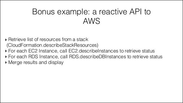 64. 64. Bonus example: a reactive API to AWS ‣ Retrieve list of resources from a stack (CloudFormation.describeStackResources) ‣ For each EC2 Instance, call EC2.describeInstances to retrieve status ‣ For each RDS Instance, call RDS.describeDBInstances to retrieve status ‣ Merge results and display