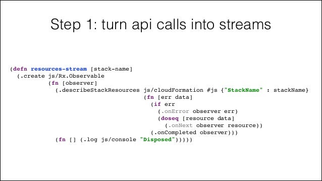 65. 65. Step 1: turn api calls into streams (defn resources-stream [stack-name]! (.create js/Rx.Observable! (fn [observer]! (.describeStackResources js/cloudFormation #js {"StackName" : stackName}! (fn [err data]! (if err! (.onError observer err)! (doseq [resource data]! (.onNext observer resource))! (.onCompleted observer)))! (fn [] (.log js/console "Disposed")))))