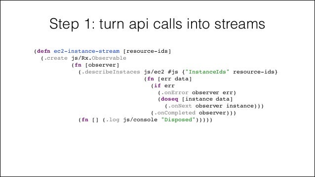 66. 66. Step 1: turn api calls into streams (defn ec2-instance-stream [resource-ids]! (.create js/Rx.Observable! (fn [observer]! (.describeInstaces js/ec2 #js {"InstanceIds" resource-ids}! (fn [err data]! (if err! (.onError observer err)! (doseq [instance data]! (.onNext observer instance)))! (.onCompleted observer)))! (fn [] (.log js/console "Disposed")))))!
