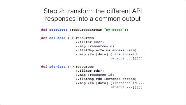 68. 68. Step 2: transform the different API responses into a common output (def resources (resourcesStream "my-stack"))! ! (def ec2-data (-> resources! (.filter ec2?)! (.map :resource-id)! (.flatMap ec2-instance-stream)! (.map (fn [data] {:instance-id ...! :status ...}))))! ! (def rds-data (-> resources! (.filter rds?)! (.map :resource-id)! (.flatMap rds-instance-stream)! (.map (fn [data] {:instance-id ...! :status ...}))))!