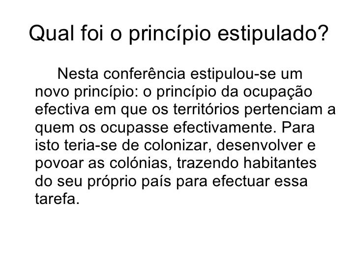 Qual foi o princípio estipulado? <ul><li>Nesta conferência estipulou-se um novo princípio: o princípio da ocupação efectiv...