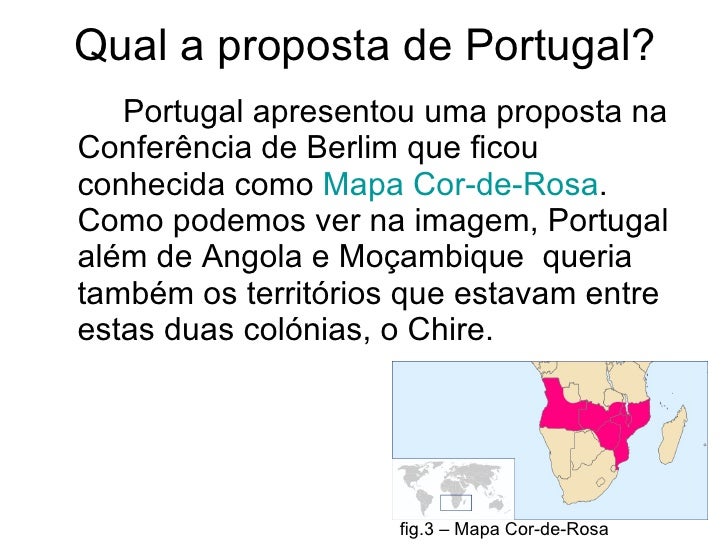 11. 11. Qual a proposta de Portugal? <ul><li>Portugal apresentou uma proposta na Conferência de Berlim que ficou conhecida como Mapa Cor-de-Rosa . Como podemos ver na imagem, Portugal além de Angola e Moçambique queria também os territórios que estavam entre estas duas colónias, o Chire. </li></ul>fig.3 – Mapa Cor-de-Rosa