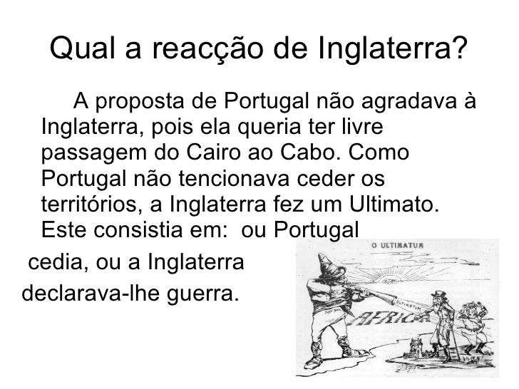 12. 12. Qual a reacção de Inglaterra? <ul><li>A proposta de Portugal não agradava à Inglaterra, pois ela queria ter livre passagem do Cairo ao Cabo. Como Portugal não tencionava ceder os territórios, a Inglaterra fez um Ultimato. Este consistia em: ou Portugal </li></ul><ul><li>cedia, ou a Inglaterra </li></ul><ul><li>declarava-lhe guerra. </li></ul>
