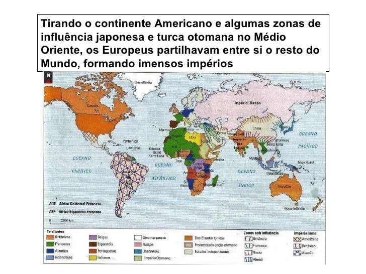 3. 3. Tirando o continente Americano e algumas zonas de influência japonesa e turca otomana no Médio Oriente, os Europeus partilhavam entre si o resto do Mundo, formando imensos impérios