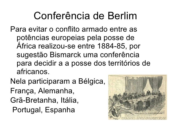 9. 9. Conferência de Berlim <ul><li>Para evitar o conflito armado entre as potências europeias pela posse de África realizou-se entre 1884-85, por sugestão Bismarck uma conferência para decidir a a posse dos territórios de africanos. </li></ul><ul><li>Nela participaram a Bélgica, </li></ul><ul><li>França, Alemanha, </li></ul><ul><li>Grã-Bretanha, Itália, </li></ul><ul><li>Portugal, Espanha </li></ul>