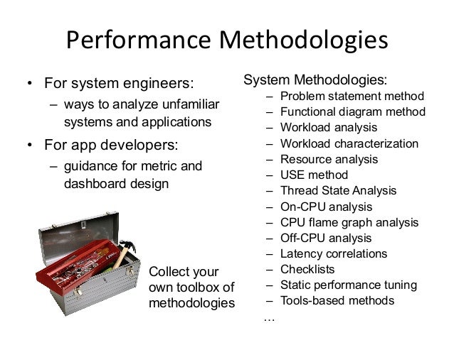 System methodologies provide a starting point for analysis, as well as guidance for quickly moving through the metrics to root cause. They also pose questions that the existing metrics may not yet answer, which may be critical in solving the toughest problems. System methodologies include the USE method, workload characterization, drill-down analysis, off-CPU analysis, and more.