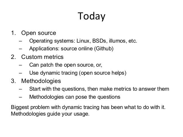 Methodologies are especially helpful for modern applications and their workloads, which can pose extremely complex problems with no obvious starting point. There are also continuous deployment environments such as the Netflix cloud, where these problems must be solved in shorter time frames. Fortunately, with advances in system observability and tracers, we have virtually endless custom metrics to aid performance analysis. The problem becomes which metrics to use, and how to navigate them quickly to locate the root cause of problems.