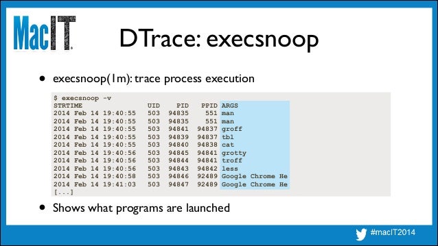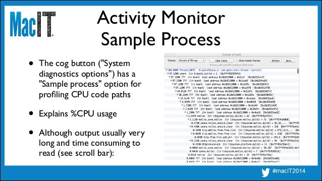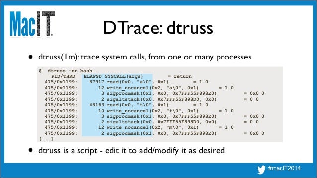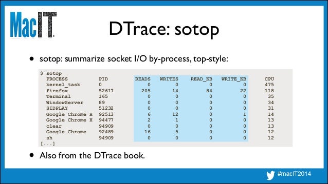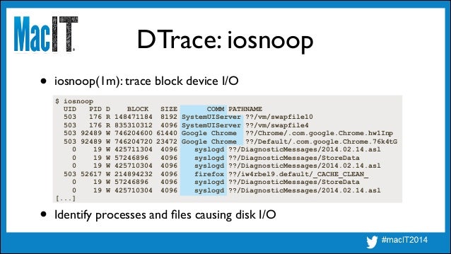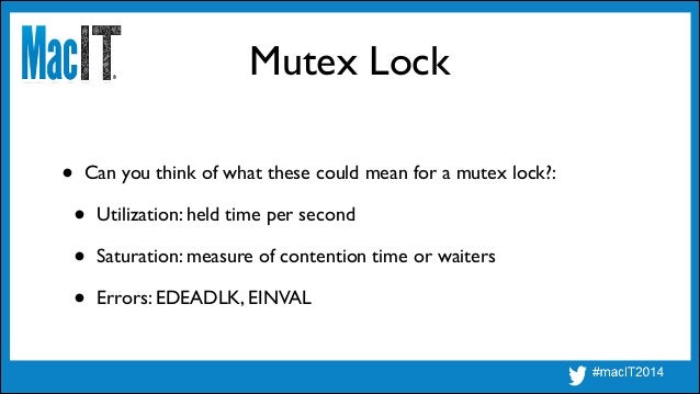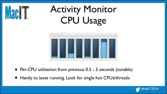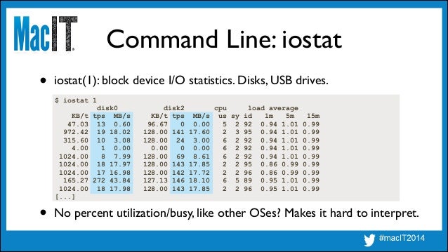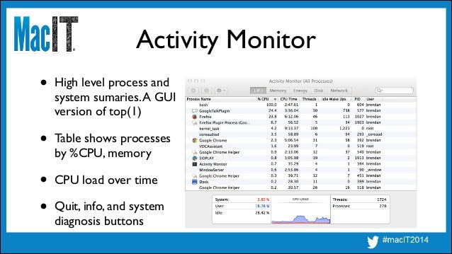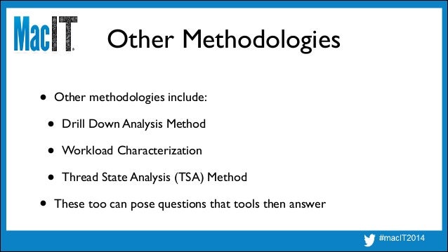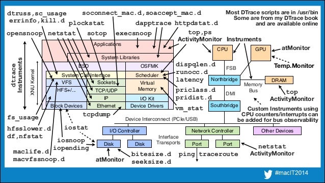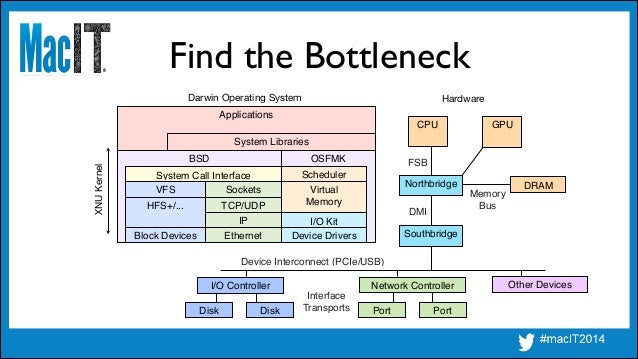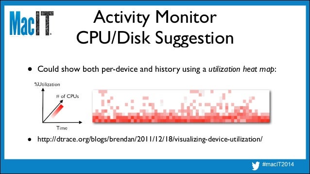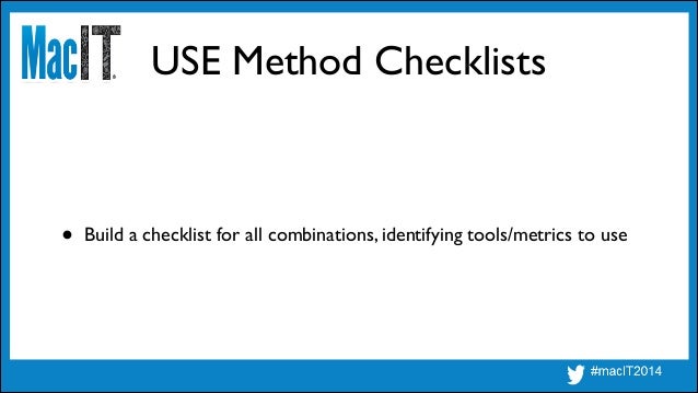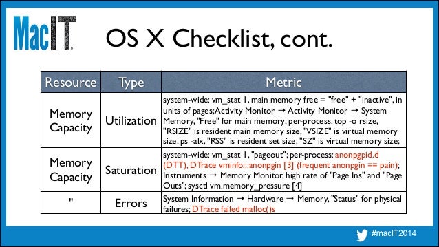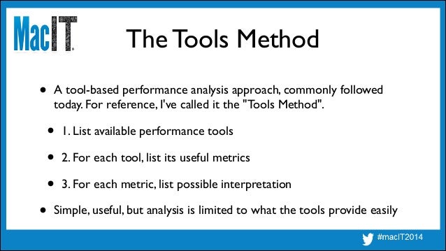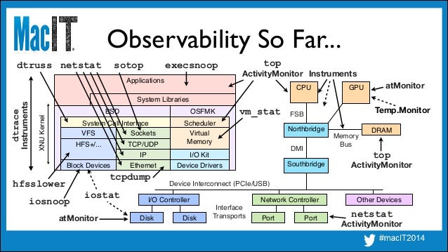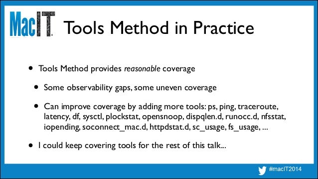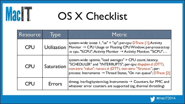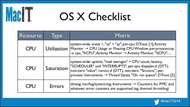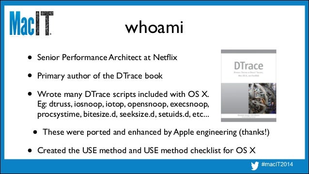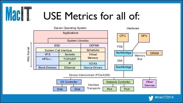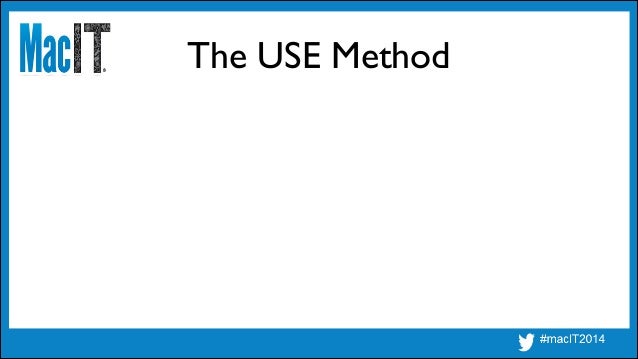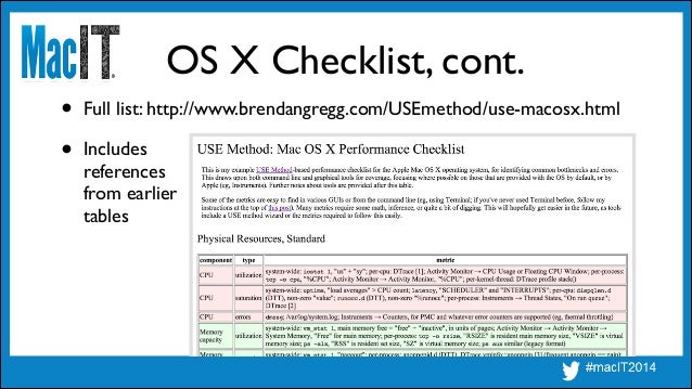 Talk for MacIT 2014. This talk is about systems performance on OS X, and introduces the USE Method to check for common performance bottlenecks and errors. This methodology can be used by beginners and experts alike, and begins by constructing a checklist of the questions we’d like to ask of the system, before reaching for tools to answer them. The focus is resources: CPUs, GPUs, memory capacity, network interfaces, storage devices, controllers, interconnects, as well as some software resources such as mutex locks. These areas are investigated by a wide variety of tools, including vm_stat, iostat, netstat, top, latency, the DTrace scripts in /usr/bin (which were written by Brendan), custom DTrace scripts, Instruments, and more. This is a tour of the tools needed to solve our performance needs, rather than understanding tools just because they exist. This talk will make you aware of many areas of OS X that you can investigate, which will be especially useful for the time when you need to get to the bottom of a performance issue.