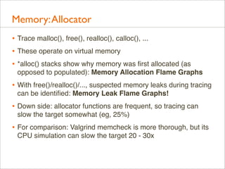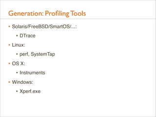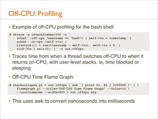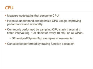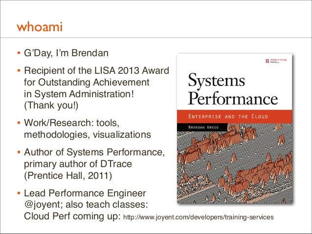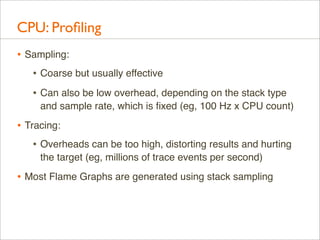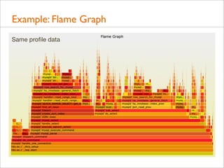 Download with free trialDelivered as plenary at USENIX LISA 2013. video here: https://www.youtube.com/watch?v=nZfNehCzGdw and https://www.usenix.org/conference/lisa13/technical-sessions/plenary/gregg . "How did we ever analyze performance before Flame Graphs?" This new visualization invented by Brendan can help you quickly understand application and kernel performance, especially CPU usage, where stacks (call graphs) can be sampled and then visualized as an interactive flame graph. Flame Graphs are now used for a growing variety of targets: for applications and kernels on Linux, SmartOS, Mac OS X, and Windows; for languages including C, C++, node.js, ruby, and Lua; and in WebKit Web Inspector. This talk will explain them and provide use cases and new visualizations for other event types, including I/O, memory usage, and latency.
