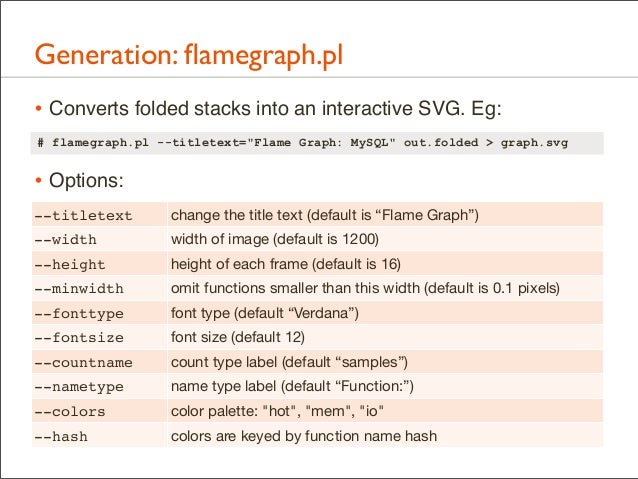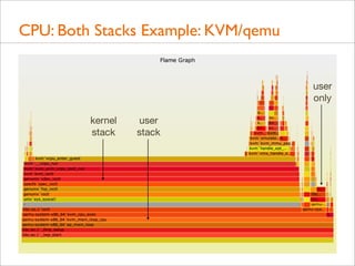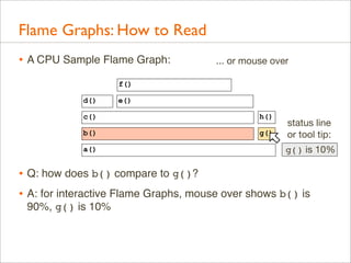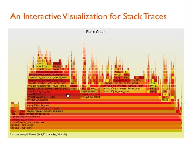 Delivered as plenary at USENIX LISA 2013. video here: https://www.youtube.com/watch?v=nZfNehCzGdw and https://www.usenix.org/conference/lisa13/technical-sessions/plenary/gregg . "How did we ever analyze performance before Flame Graphs?" This new visualization invented by Brendan can help you quickly understand application and kernel performance, especially CPU usage, where stacks (call graphs) can be sampled and then visualized as an interactive flame graph. Flame Graphs are now used for a growing variety of targets: for applications and kernels on Linux, SmartOS, Mac OS X, and Windows; for languages including C, C++, node.js, ruby, and Lua; and in WebKit Web Inspector. This talk will explain them and provide use cases and new visualizations for other event types, including I/O, memory usage, and latency.