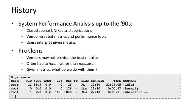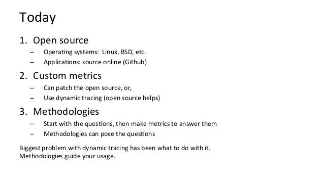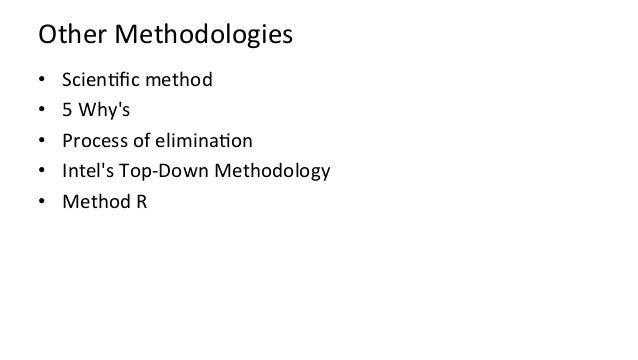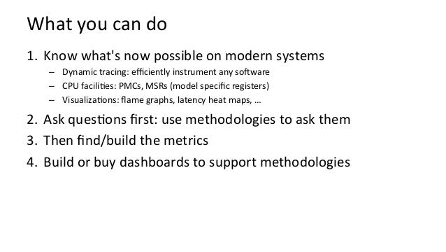 There's a new way to approach performance analysis that can guide you through the metrics. Instead of starting with traditional metrics and figuring out their use, you start with the questions you want answered then look for metrics to answer them. Methodologies can provide these questions, as well as a starting point for analysis and guidance for locating the root cause. They also pose questions that the existing metrics may not yet answer, which may be critical in solving the toughest problems. System methodologies include the USE method, workload characterization, drill-down analysis, off-CPU analysis, chain graphs, and more.