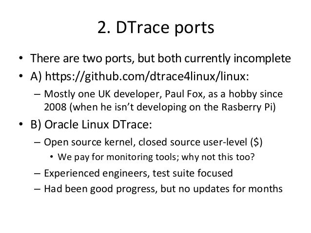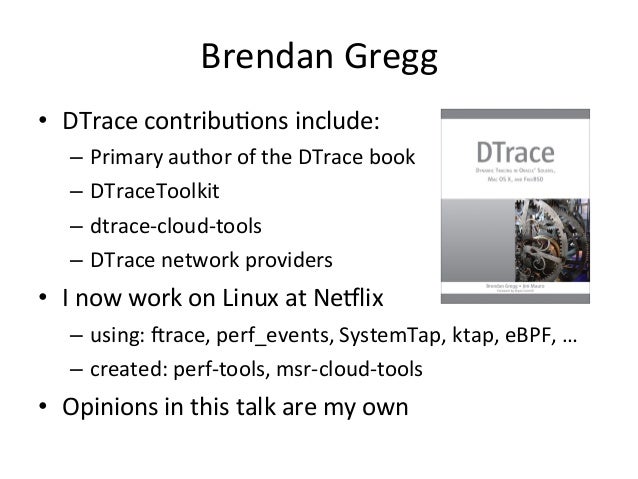 Tracing Summit 2014, Düsseldorf. What can Linux learn from DTrace: what went well, and what didn't go well, on its path to success? This talk will discuss not just the DTrace software, but lessons from the marketing and adoption of a system tracer, and an inside look at how DTrace was really deployed and used in production environments. It will also cover ongoing problems with DTrace, and how Linux may surpass them and continue to advance the field of system tracing. A world expert and core contributor to DTrace, Brendan now works at Netflix on Linux performance with the various Linux tracers (ftrace, perf_events, eBPF, SystemTap, ktap, sysdig, LTTng, and the DTrace Linux ports), and will summarize his experiences and suggestions for improvements. He has also been contributing to various tracers: recently promoting ftrace and perf_events adoption through articles and front-end scripts, and testing eBPF.