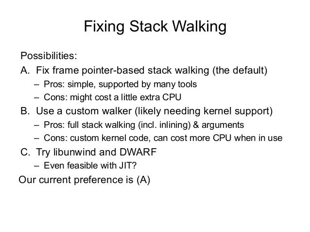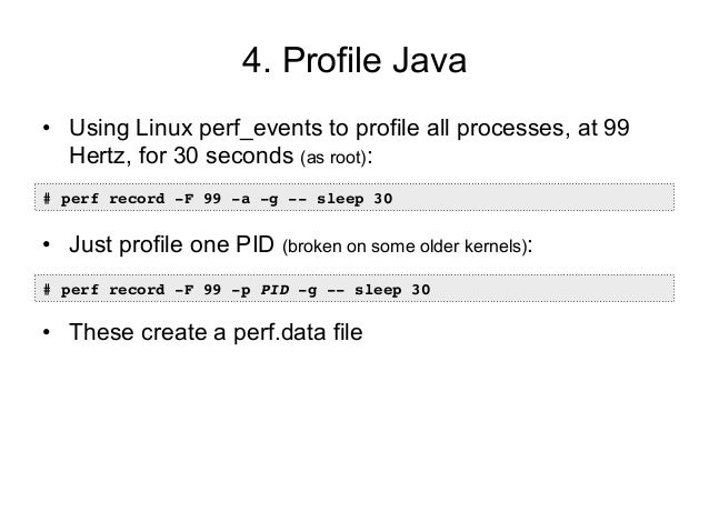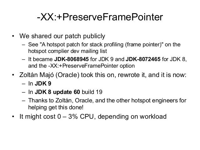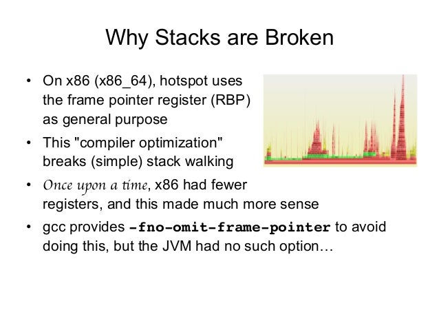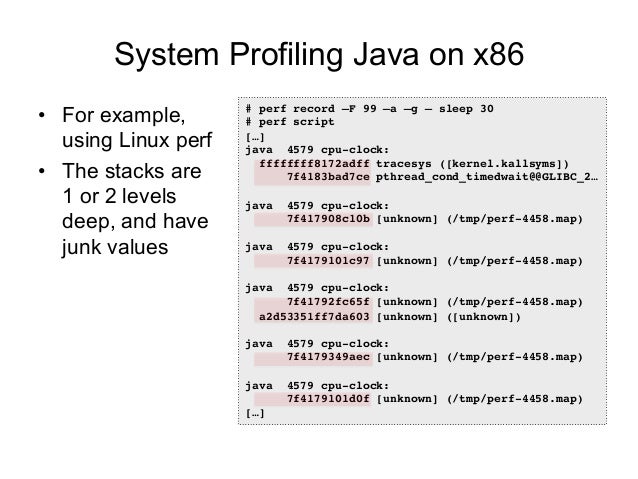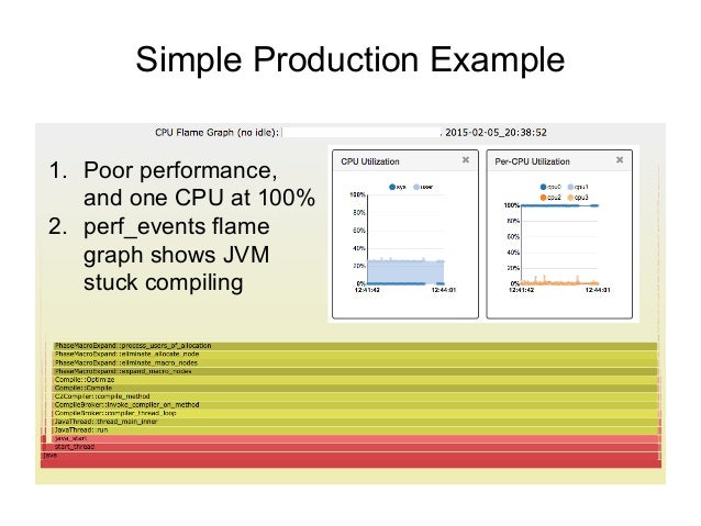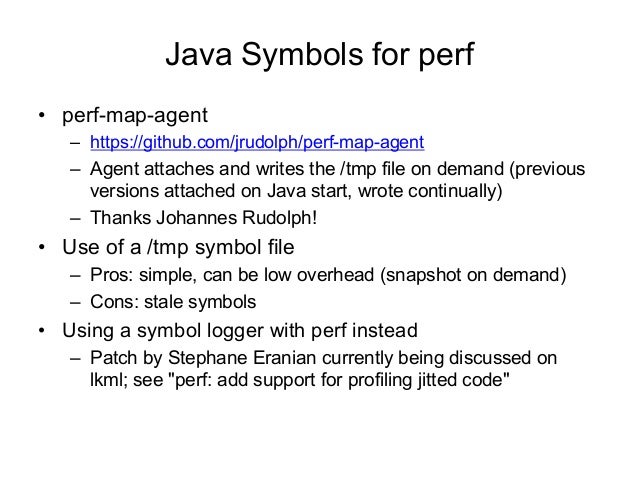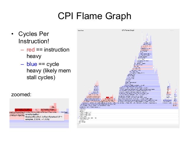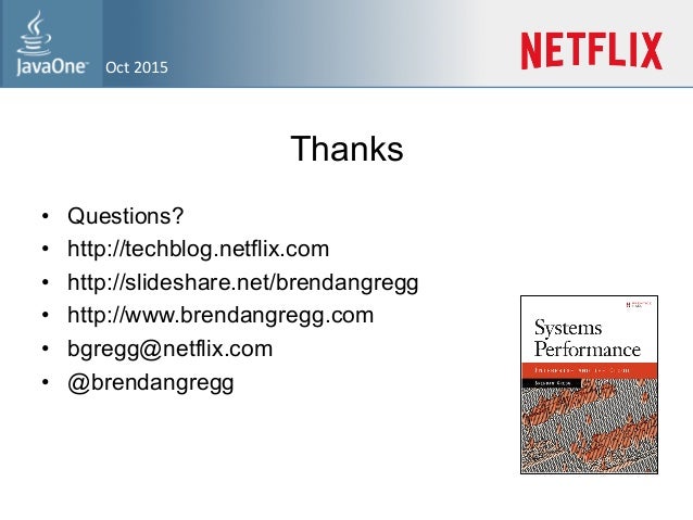 Slides for JavaOne 2015 talk by Brendan Gregg, Netflix (video/audio, of some sort, hopefully pending: follow @brendangregg on twitter for updates). Description: "At Netflix we dreamed of one visualization to show all CPU consumers: Java methods, GC, JVM internals, system libraries, and the kernel. With the help of Oracle this is now possible on x86 systems using system profilers (eg, Linux perf_events) and the new JDK option -XX:+PreserveFramePointer. This lets us create Java mixed-mode CPU flame graphs, exposing all CPU consumers. We can also use system profilers to analyze memory page faults, TCP events, storage I/O, and scheduler events, also with Java method context. This talk describes the background for this work, instructions generating Java mixed-mode flame graphs, and examples from our use at Netflix where Java on x86 is the primary platform for the Netflix cloud."