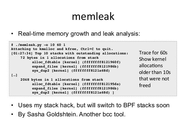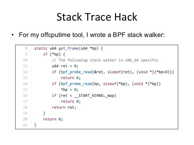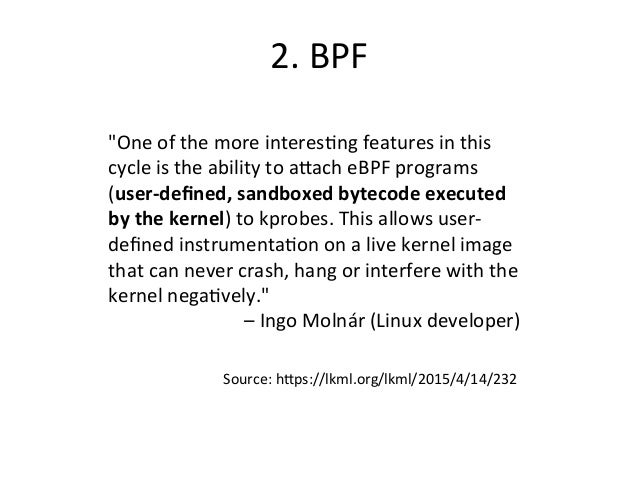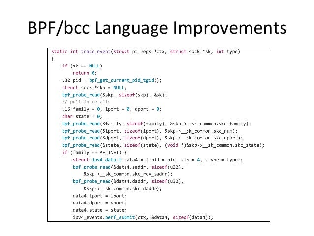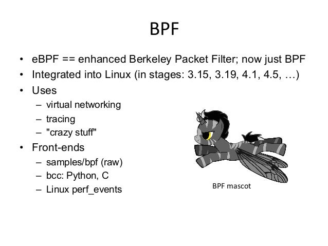 Video: https://www.facebook.com/atscaleevents/videos/1693888610884236/ . Talk by Brendan Gregg from Facebook's Performance @Scale: "Linux performance analysis has been the domain of ancient tools and metrics, but that's now changing in the Linux 4.x series. A new tracer is available in the mainline kernel, built from dynamic tracing (kprobes, uprobes) and enhanced BPF (Berkeley Packet Filter), aka, eBPF. It allows us to measure latency distributions for file system I/O and run queue latency, print details of storage device I/O and TCP retransmits, investigate blocked stack traces and memory leaks, and a whole lot more. These lead to performance wins large and small, especially when instrumenting areas that previously had zero visibility. This talk will summarize this new technology and some long-standing issues that it can solve, and how we intend to use it at Netflix."