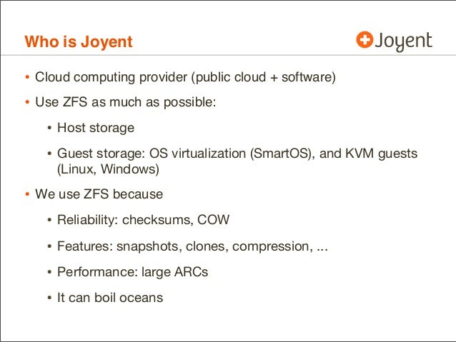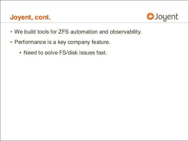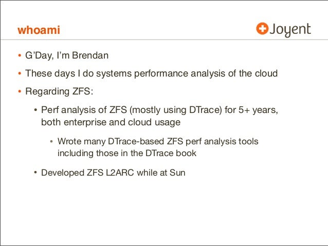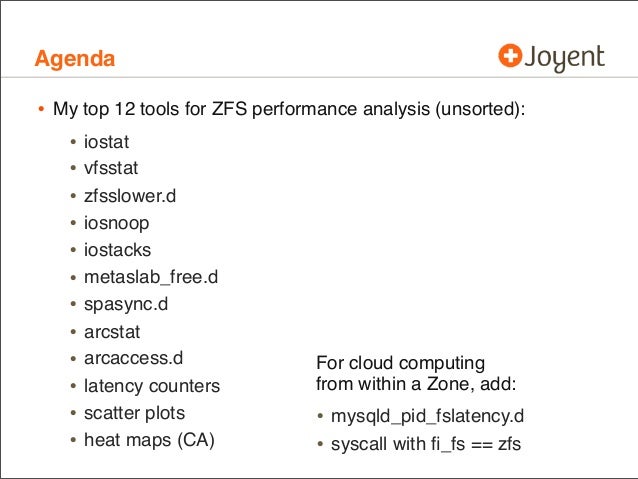 zfsday talk (a video is on the last slide). The performance of the file system, or disks, is often the target of blame, especially in multi-tenant cloud environments. At Joyent we deploy a public cloud on ZFS-based systems, and frequently investigate performance with a wide variety of applications in growing environments. This talk is about ZFS performance observability, showing the tools and approaches we use to quickly show what ZFS is doing. This includes observing ZFS I/O throttling, an enhancement added to illumos-ZFS to isolate performance between neighbouring tenants, and the use of DTrace and heat maps to examine latency distributions and locate outliers.