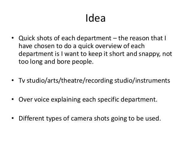 2. 2. Idea • Quick shots of each department – the reason that I have chosen to do a quick overview of each department is I want to keep it short and snappy, not too long and bore people. • Tv studio/arts/theatre/recording studio/instruments • Over voice explaining each specific department. • Different types of camera shots going to be used.