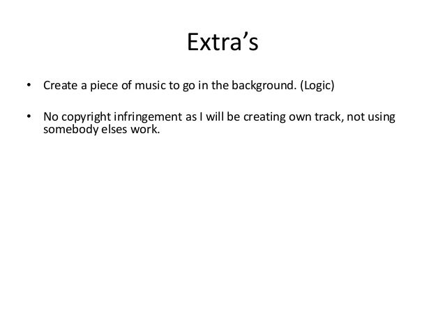 4. 4. Extra’s • Create a piece of music to go in the background. (Logic) • No copyright infringement as I will be creating own track, not using somebody elses work.